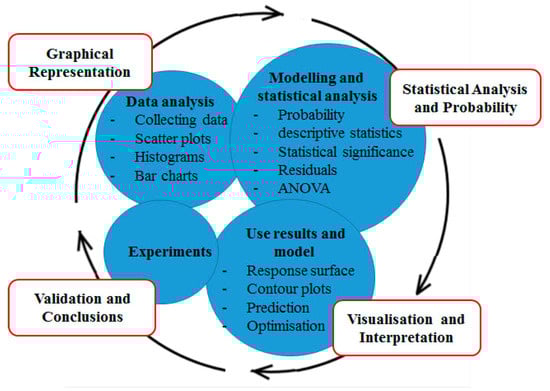 Regardless of the DoE design employed, the goal is to provide a methodology for conducting controlled experiments with the aim of identifying the vital process inputs and investigating interactions between them []. At a screening level, after the experimental data are entered, the DoE software generates a variety of graphs that are used to interpret the results obtained. These may be scatter plots, histograms, bar charts and Pareto charts that allow the researcher to identify the distribution of the data and statistical significance of the variables tested []. Different screening analysis methods have been used in the field of protein production [,,,]. Figure 5 illustrates a typical DoE data analysis and interpretation route from data visualisation, through experiment validation to conclusion.