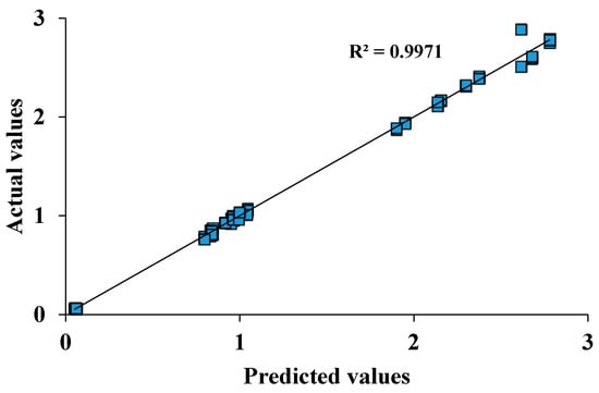 The coefficient value of R2 defines how well the model fits the data. The closer the R2 is to 1, the better it describes the experimental data []. The Adjusted R2 is used to check the adequacy of the model by measuring the amount of variation about the mean derived from the model; the closer the value is to 1, the better it describes the model []. For example, in Table 9, the R2 = 0.9971 indicates the significance of regression of the fitting equation and therefore, adequacy of discrimination, indicating that only 0.29% of the total variation could not be explained by the fitting equation []. When R2 = 99.71%, Adj-R2 = 99.63%, Pred-R2 = 99.48% are in good agreement with each other (as in Table 9), this provides confidence in the accuracy of the model [].