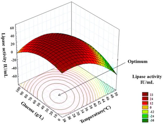 An example of response surface and contour plot adapted from Nelofer et al., 2012 []. The figure depicts the two-factor interaction (in this case the two factors explored are glucose and culturing temperature) where one factor influences the response of another factor. It also shows the visualisation of optimum levels. The colour scale indicates the level of lipase activity (IU/mL) where red indicates the region of optimal yield, yellow indicates medium yield, and green indicates low yield. In this case, the optimal enzyme activity (33 IU/mL) was achieved at a culture temperature between 30 °C and 34 °C; and a glucose concentration between 40 g/mL–50 g/mL. Image used with permission.