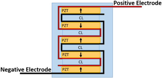 CLACS schematic. Piezoelectric (PZT) discs were connected electrically in parallel using two strips of copper foil, acting as the positive and negative electrodes, and silver conductive epoxy. The discs were then stacked mechanically in series with 0.4 mm compliant layers (CL) of matrix epoxy between each PZT disc.