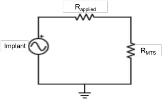 Circuit diagram. The implants were connected in series with the applied resistances (Rapplied) and in parallel with the MTS. A voltage divider was used to calculate the voltage produced by the implant, scaled by the applied resistance and the resistance of the MTS (RMTS).