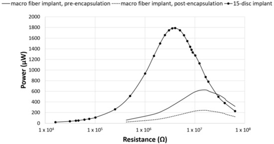 As seen in Figure 4, the 15-disc implant was able to produce substantially more power across the resistance sweep as compared to the pre- and post-encapsulated PZT macro-fiber implants, for similar PZT volumes, despite a 5% decrease in PZT surface area to implant footprint [25,26]. This increase in power could be attributed to either the PZT discs themselves or the fabrication method used to produce the PZT disc composite implants. The PZT disc composite implants were much more efficient at converting cyclic loads to power. Additionally, the resistance corresponding to maximum power was lower for the 15-disc implant and it did not exhibit the same lack of interface strength, fabrication, or PZT supply chain problems as the macro-fiber implants.