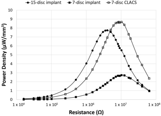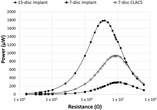 Power as a function of applied resistance and PZT disc implant type. Power generated for the three implant configurations across an applied resistive load from 16.0 kΩ to 63.4 MΩ. The seven-disc CLACS implant produced more power than the seven-disc implant for the same volume of PZT. The effect of the PZT volume and compliant layer on the power generated was clearly illustrated.