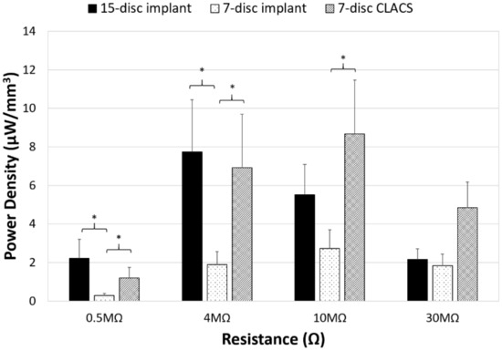 Power density comparison between PZT disc implants. Power density (power normalized by volume of PZT for each implant type) generated for the three implant configurations (15-disc implant, seven-disc implant, and seven-disc CLACS implant) at a low applied resistive load (0.5 MΩ), resistance of maximum power for the 15-disc implant (4 MΩ), resistance of maximum power for both seven-disc implants (10 MΩ), and at a high applied resistive load (30 MΩ). * Represents significant difference (p < 0.05). The largest effect of implant type was observed closest to the resistance corresponding to maximum power.