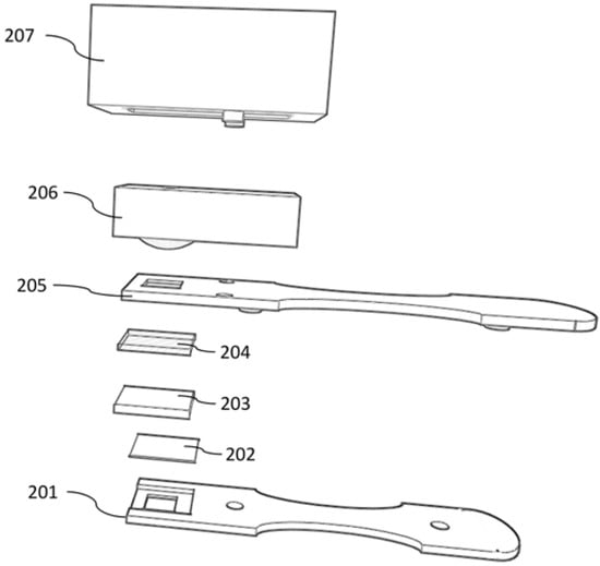 Schematic diagram of the electronic nose. 201 and 205—3-D printed housing; 202—plastic film; 203—gauze pad; 204—PTFE membrane; 206—MQ-135 sensor; and 207—3-D printed housing for electronic nose.