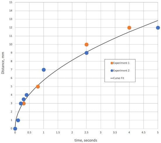 Another process that is relevant in understanding Korteweg stresses with two miscible solutions is the rate at which mixing can occur between two liquid fronts. It is also illustrative to use the same video time lapse system to observe mixing in two capillary tubes, where one tube contains water with a blue dye and the other a 50% glycerol solution with a yellow dye. Figure 3 gives the results of two video time-lapse movies showing that the aqueous solution penetrates the 50% glycerol capillary tube relatively far within a few seconds. For illustrative purposes and to compare these results with other investigations of water and glycerol dynamics in horizontal capillary tubes, a curve fit of d ∝ t1/3 is also shown in Figure 3. This exploration of mixing is intended to verify that in the porous network of the gauze pad, once the two liquid fronts meet, there is some degree of mixing in a very short timeframe. The interface between water and a 50% glycerol solution continues for longer periods of time, possibly for as long as 10,000 s [].