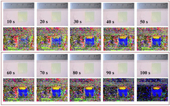 This figure shows 10 sets of 2 images, where the top image is the unprocessed still frame that includes a time stamp, and the bottom image is the result of subtracting that frame from the initial frame at time zero. This time-lapse comparison of subtracted images to unprocessed images is the series of frame at time zero. This time-lapse comparison of subtracted images to unprocessed images is the series of frames where solution (1) is 50% glycerol (yellow) and solution (2) is 100% water (blue).
