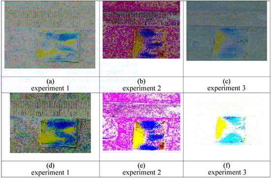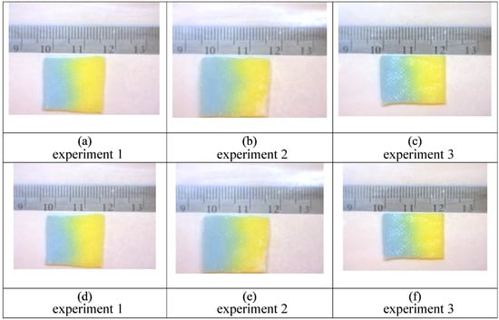 These are still frames from triplicate experiments (1–3) also shown in Figure 7. The panels above show unprocessed images for an initial application of 50% glycerol (yellow) followed by 100% water (blue). Images (a–c) are at 5 min and images (d–f) are at fifteen minutes. While there is some visual evidence of dye diffusion at the interface between the two colored liquids, the color variations within the gauze pads are not visible, as in Figure 7, without imaging processing to accentuate the subtle changes of color due to mixing.