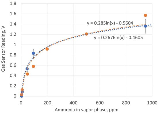 Calibration readings using the electronic nose assembly with ammonia solutions (blue filled circles and dashed line), compared to manufacturer’s data (orange filled circles and orange dashed line). The load resistor is set at 2.5 k Ohms.