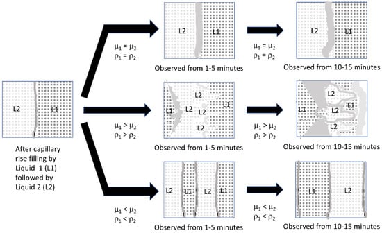 The results of the gauze pad visualization after adding both liquids indicated that there were three categories of results, as illustrated in the schematic diagram in Figure 13. When the viscosity and density of the two liquids match (top arrow), there was some low level of mixing due to diffusion at the interface. However, when liquid 2 had a higher viscosity and density than liquid 1 (bottom arrow) and both liquids were miscible (see supplemental files), steady movement by both liquid fronts was observed resulting in a wide zone of mixed (green color) liquid. When the order of addition was reversed and the more viscous and higher density liquid was added first (middle arrow), liquid movement was observed leading to mixing, but the pattern was generally two lobes or “fingers”.