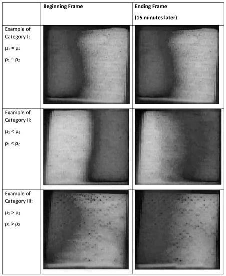 A histogram analysis of these and the drop saturation component of the HSB images is provided in the supplemental file section, but a more compact representation of the dynamics of mixing is given by analyzing the mean pixel values over time for the three categories of gauze filling (see Figure 15). The data clearly indicates that Korteweg stresses with or without viscous fingering create substantial mixing, thereby lowering the saturation values of the gauze image steadily during the 15 min of imaging. When the two liquids have the same density and viscosity (Category I), Figure 15 shows a slight increase in mean pixel value. We interpret this result as indicating essentially no significant mixing over 15 min.
