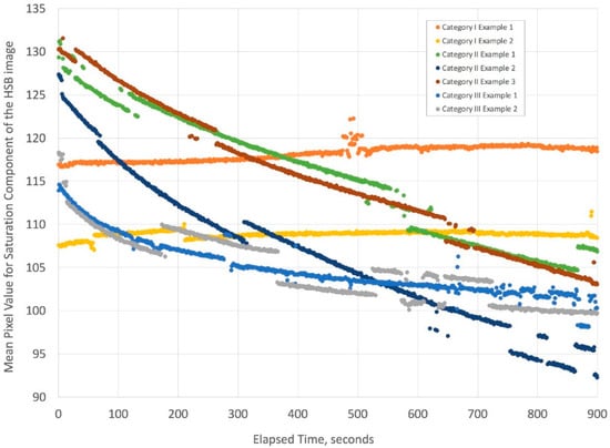 A study of 100% glycerol placed in a capillary tube, which is subsequently immersed at both ends into reservoirs of water [], showed that the interface between the two liquids are visible even after 10,000 s and the interface moves with a 2/3 (short time period) and 1/3 power relationship (overall), with respect to time. For our study, it was difficult to determine the speed of movement using RGB images of the gauze pad. A better method to gauge changes was to convert the RGB images to the hue, saturation, brightness format (HSB), and measure the saturation values of the mean pixel value and the pixel value distributions, which are given in a scale of 0–255. By studying videos of a yellow and a blue drop on a water repellant surface converging to form the color green, the saturation pixel values were determined to be in the order of yellow > blue > green. This order remained consistent with the gauze pad images and the saturation levels are distinct enough to visually track the changes, as seen in Figure 14.