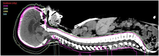 Given the susceptibility of children to late effects from RT (including neurocognitive deficits, neuroendocrine deficits, audiovisual toxicity, growth abnormalities, and second malignancies, among others), the potential for PBT to minimize normal tissue radiation exposure through the absence of exit dose represents an enticing opportunity to enhance the therapeutic ratio. Multiple dosimetric studies have demonstrated a significant reduction in dose to critical organs at risk, as well as uninvolved brain more generally, in the treatment of diverse pediatric brain tumors using PBT; these studies confirmed dosimetric benefits of PBT over advanced photon-based techniques (including IMRT) for patients with medulloblastoma, ependymoma, and craniopharyngioma [52,53,54,55,56,57]. This has been most pronounced for patients who require CSI, such as medulloblastoma patients (Figure 2). With CSI, posterior positioning of proton beam(s) targeting the spinal canal as part of CSI allows for dose to cover the spinal canal and vertebral bodies, with minimal dose anteriorly into critical organs including thyroid, heart, lungs, gastrointestinal structures (i.e., pancreas), and ovaries, among others (Figure 2) [52,53,57,58]. So pronounced are the dosimetric differences in sparing anterior structures with PBT for CSI that the pediatric radiation oncology community has debated in recent years whether PBT represents the only standard of care option for pediatric patients requiring CSI (Figure 2) [59,60].