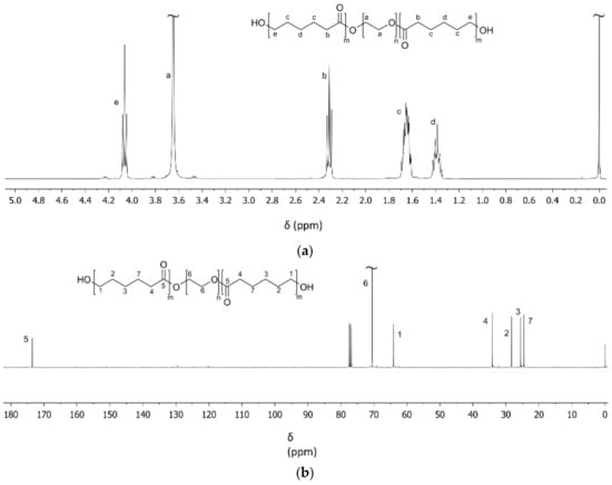 Characteristic (a) 1H-NMR and (b) 13C-NMR spectra of PCL5-PEG10-PCL5 triblock copolymers after purification by precipitation.