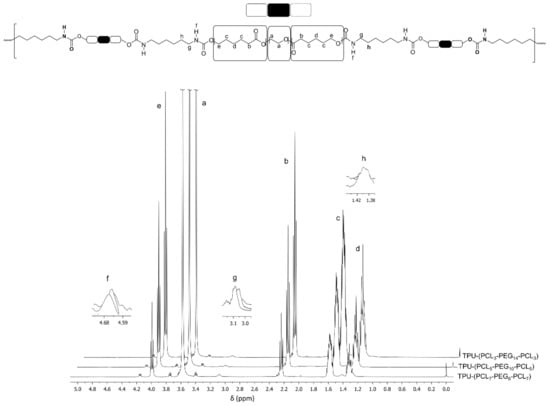 Figure 3 shows the characteristic 1H-NMR spectra of TPUs based on PCL-b-PEG-b-PCL triblock copolymer after purification. All individual signals that correspond to the PEG and PCL segments of the consistent triblock copolymer, as well as those of the formed urethane bonds, can be observed.