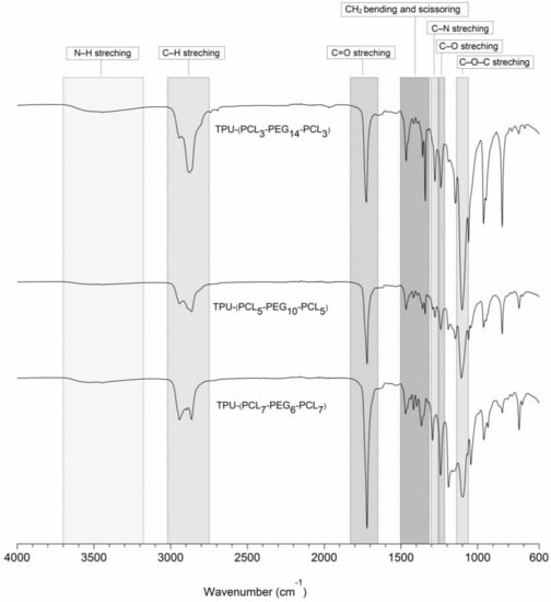 These FTIR results, together with the 1H-NMR and 13C-NMR data, confirm the successful formation of TPU-(PCL-b-PEG-b-PCL) multi-block copolymers.