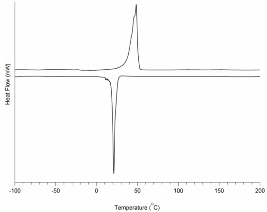 Differential Scanning Calorimetry (DSC) analyses were performed using a Pyris 1 DSC (Perkin Elmer, Waltham, MA, USA). Polymer samples (5–10 mg) were heated in stainless steel pans from −100 °C to 250 °C at a rate of 10 °C/min, rapidly cooled to −100 °C at 20 °C/min, after which a second scan was taken at a rate 10 °C/min. The glass transition (Tg) and the melting temperature (Tm) were determined using data from the second heating run.
