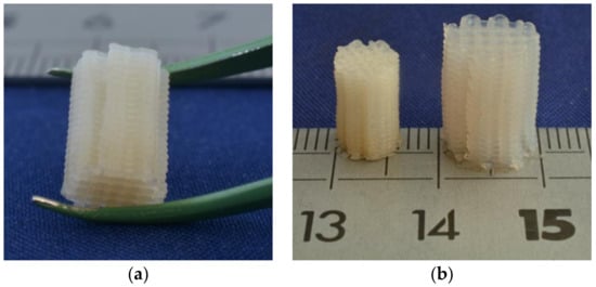 Designed tissue engineering scaffolding structures were prepared by fused deposition modelling (FDM) of the TPU-(PCL5-PEG10-PCL5) multi-block copolymer, as this thermoplastic hydrogel shows very high water uptake and excellent mechanical properties in the wet state. This TPU has a melting temperature of approximately 49 °C and a decomposition temperature of approximately 400 °C, as determined by thermogravimetric analysis (details not shown). To allow processing using a conventional commercially available FDM machine, filaments with a diameter of approximately 2.5 mm were first prepared by melt extrusion at 120 °C. The TPU filaments were then fed into the FDM apparatus to prepare the designed structures as described in the experimental part. The conditions were not thoroughly optimized, but an extrusion temperature of 180 °C, a nozzle diameter of 0.4 mm and a printing speed of 1 mm/s were found to be well suited. The building platform was kept at a temperature near room temperature, as this is close to the maximum crystallization temperature (see Table 2). Figure 7a shows one of the 3D printed structures.