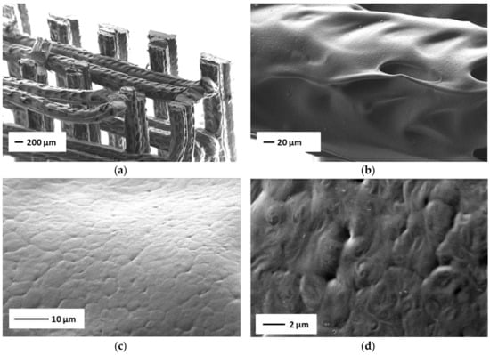 SEM images of 3D printed structures prepared from TPU-(PCL5-PEG10-PCL5) in the dry state at different magnifications. (a) overview of a printed structure, (b–d) images of the surface of the printed structure at higher magnifications.