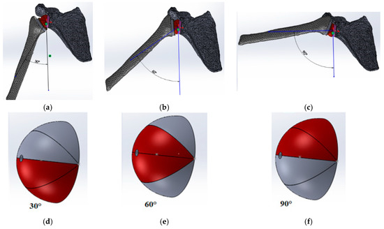 Contact surfaces and zone of applied forces on the glenosphere depending on arm inclination (a) 30° position; (b) 60° position; (c) 90° position; (d) applied force for 30°; (e) applied force for 60°; (f) applied force for 90°.