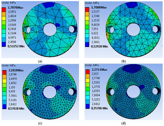 The distribution of Von Mises stresses on the bone graft for different meshes. Mesh (a): coarse; Mesh (b): medium; Mesh (c): fine; Mesh (d): very fine.