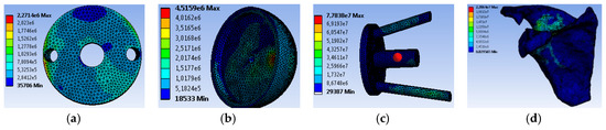 The distribution of Von Mises stresses in the cases of: (a) Graft, (b) glenosphere, (c) support with screws and (d) scapula.