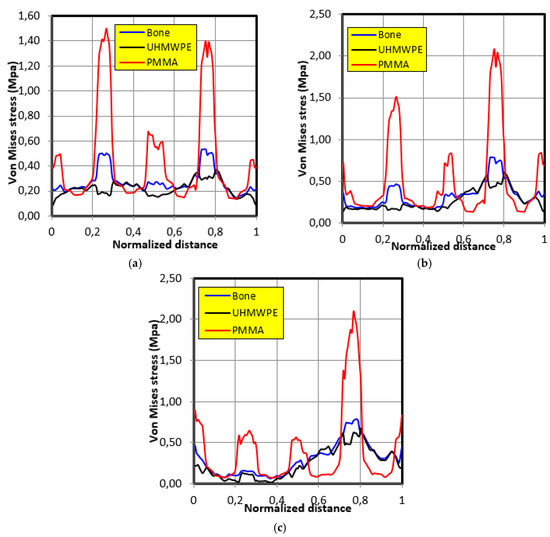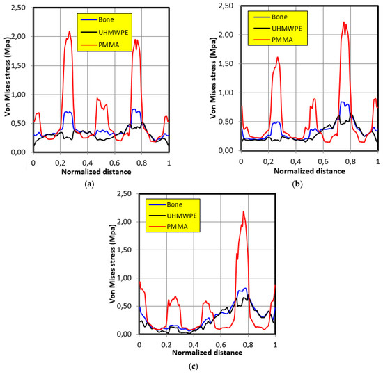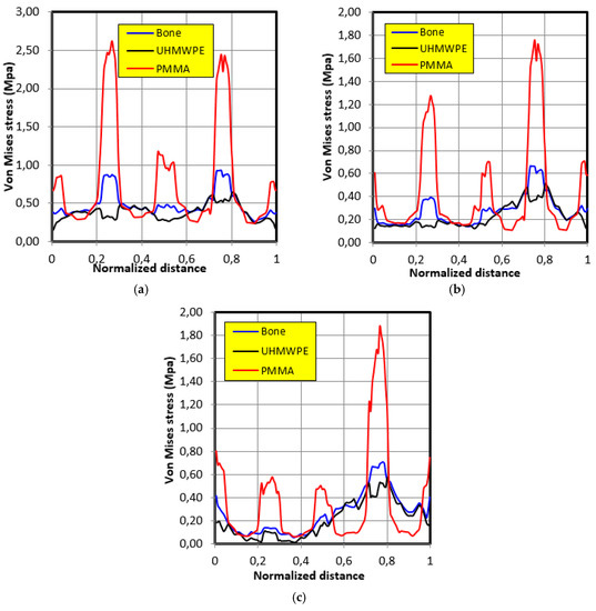 Figure 10 illustrates the stress distribution along the graft contour for the motion of individual 1. It can be noted that the stress variation in ultra-high molecular weight polyethylene (UHMWPE) was closer than that of bone grafting. It is also important to note that the maximum stress in the cases of bone and polyethylene UHMWPE were 0.8 MPa and 0.7 MPa, respectively, whereas in the case of polymethyl methacrylate (PMMA), this was 2.18 MPa.
