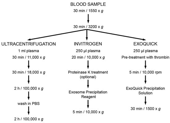 - Szatanek, R.; Baran, J.; Siedla, M.; Baj-Krzyworzeka, M. Isolation of extracellular vesicles: Determining the correct approach. Int. J. Mol. Med. 2015, 36, 11–17. [Google Scholar] [CrossRef] [PubMed]