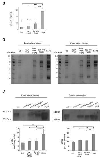 Efficiency of EV enrichment. (a) Protein concentration of the EV fractions isolated was determined by bicinchoninic acid (BCA) assay. The graph shows the mean + SD of the three independent experiments. (b) Coomassie blue staining of the EV fractions. Equal volume and equal amount of protein were loaded for a general protein stain. (c) Representative detection of CD63 in EV fractions by Western blot. Data shown are the mean + SD of three independent experiments. UC: Ultracentrifugation; INV+ProtK: Invitrogen kit and treatment with proteinase K; INV+ProtK (TCA): TCA precipitated protein from INV+ProtK fractions; INV w/o ProtK: Invitrogen kit without digestion with proteinase K; ExoQ: ExoQuick kit. * p < 0.05; ** p < 0.01; *** p < 0.001.