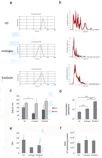 The polydispersity index (PDI) was also measured by DLS (Figure 3e) and the methods compared, although no significant differences were found. EV fractions isolated by ultracentrifugation obtained the highest PDI values, indicating more variable size of these vesicles in comparison with those isolated using the commercial kits. These results are in line with the NTA measurements, where a more heterogeneous population of EV was detected in the fractions isolated by ultracentrifugation.
