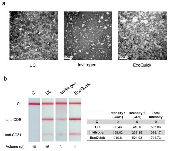 After EV enrichment, we could observe intact EV by TEM. Figure 4a shows representative TEM images of EV isolated by ultracentrifugation, Invitrogen and ExoQuick kits. Equal volumes of each fraction were used. We can appreciate less EV per field in the sample isolated by ultracentrifugation, which is in agreement with the differences in the concentration of EV measured by NTA. Regarding the sample isolated using ExoQuick, the EV could not be observed due to the precipitation reagent of the kit, which interferes with the electron beam producing a blurred image. Fractions were filtrated in order to remove the precipitation reagent, but even so it was not possible to detect them. Therefore, we concluded that the ExoQuick kit is not suitable for TEM.