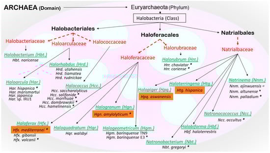 - Gupta, R.S.; Naushad, S.; Fabros, R.; Adeolu, M. A phylogenomic reappraisal of family-level divisions within the class Halobacteria: Proposal to divide the order Halobacteriales into the families Halobacteriaceae, Haloarculaceae fam. nov., and Halococcaceae fam. nov., and the order Haloferacales into the families, Haloferacaceae and Halorubraceae fam nov. Antonie van Leeuwenhoek 2016, 109, 565–587. [Google Scholar] [CrossRef] [PubMed]
