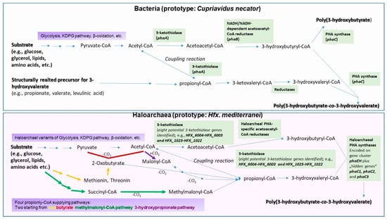 Genome analysis of Hfx. mediterranei has also evidenced eight potential 3-ketothiolase genes in H. mediterranei, which might express enzymes responsible for the condensation of two acetyl-CoA molecules to acetoacetyl-CoA, or one acetyl-CoA and one propionyl-CoA to 3-ketovaleryl-CoA. It was shown that only the 3-ketothiolases encoded by HFX_6004-HFX_6003 and HFX_1023-HFX_1022 are involved in the biosynthesis of PHBHV. Knockout of HFX_6004-6003 leads to the accumulation of PHB homopolyester without the 3HV building blocks, while simultaneous knockout of HFX_6004-6003 and HFX_1023-1022 stopped the strain´s ability to produce PHA. This was the first report on haloarchaeal 3-ketothiolases, which reveled considerable differences to their bacterial relatives in subunit composition and catalytic residue []. Finally, genes encoding for PHA-specific acetoacetyl-CoA reductases, catalyzing the reduction of ketoacyl-CoAs to hydroxyacyl-CoAs as the substrates of PHA synthases were discovered and characterized in Har. hispanica [] and Hfx. mediterranei []. Further, these enzymes displayed considerable differences to their eubacterial counterparts encoded by phaB genes. Only recently, Xiang summarized the genomic and enzymatic particularities of PHA biosynthesis by Hfx. mediterranei in a comprehensive way []. Figure 2 provides a simplified schematic of the pathways leading to PHB and PHBHV by eubacteria and haloarchaea, respectively. For haloarchaea, especially the multiple propionyl-CoA supplying pathways are highlighted.