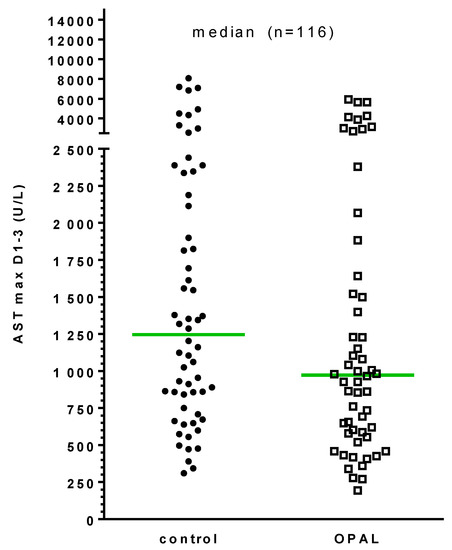 Peak AST values within the first three days after liver transplantation were higher in the control group compared to the treatment group. However, this did not reach statistical significance (1246 (310–8064) versus 972 (194–17577), control versus OPAL; cf Figure 2).