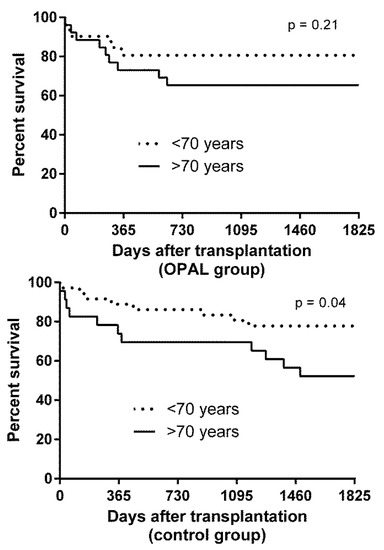 In the treatment group patient survival was 80% after one and five years when transplantation was carried out with younger donors. In donors aged 70 or more the patient survival was 70% and 65% after one and five years, without statistical significant differences between groups. However, the same analysis in the control group demonstrated significantly worse survival after transplantation of allografts from donors aged 70 years or more with one and five year patient survival of 70% and 48%. Donors aged younger than 70 years led to a patient survival of 85% and 75% after one and five years, respectively.
