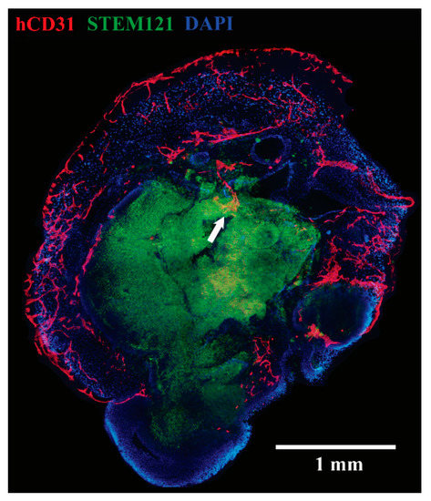 Endothelial cells have penetrated the brain tumor organoid from ‘outside-in’. hCD31 (red), STEM121 (green), DAPI (blue). Reprinted with permission from Pham et al., 2018 [1].