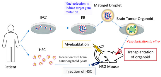 The efficacy of brain tumor immunotherapy could be evaluated in a rodent vascularized human brain tumor organoid model with a humanized immune system. Hematopoietic stem cells (HSC) or their progeny are incubated with brain tumor organoid lysate to prime an immune reaction against the brain tumor organoid. IPSC: Induced pluripotent stem cell, EB: embryoid body.