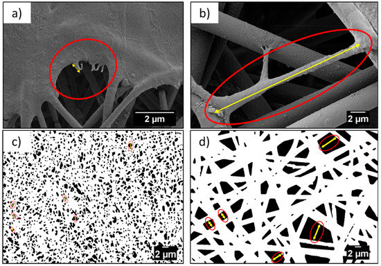 Example of measurement (a,b) cells’ filopodia, Lc, and (c,d) distance measurement between fibers, Sf, from the SEM micrographs between nanofibers and microfibers, respectively.