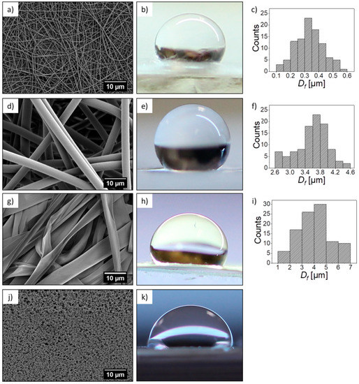 Poly(methyl methacrylate) (PMMA) (a) nanofibers, (d) microfibers, (g) ribbons, (j) and films SEM micrographs, and their corresponding representative images of the water droplet used for contact angle measurement (b,e,h,k), respectively, and (c,f,i) histograms showing the diameter of the fiber size distribution.