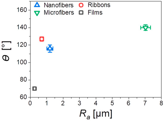 Advancing water contact angles (θ) on electrospun PMMA nanofibers, microfibers, ribbons, and spin-coated films were measured using deionized water (Spring 5UV purification system, Hydrolab, Poland, γ = 72.2 mJm−1). A total of 3 μL volume droplets were pipetted onto the samples and, after 3 s from the water deposition, the image was taken using a DSLR camera (EOS 700D, Canon, Tokyo, Japan) with a macro lens (EF-S 60mm f/2.8 Macro USM). Experiments were carried out in the laboratory at T = 25 °C and H = 45%. The contact angles were measured using a drop shape analysis plug-in, in ImageJ (Fiji, version J1.46r., Würzburg, Germany). The average contact angle was calculated from measurements taken on 10 droplets, with the error based on the standard deviation.