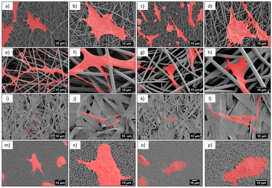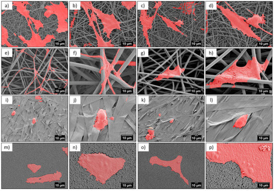 SEM micrographs of cells (colored in red) after 1 day in cell culture on PMMA scaffolds built of (a–d) nanofibers, (e–h) microfibers, (i–l) ribbons, and (m–p) film.