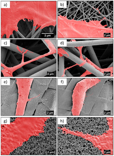 SEM micrographs showing cell attachment to a different type of scaffold, after three days—(a,b) nanofibers, (c,d) microfibers, (e,f) ribbons, and (g,f) film.