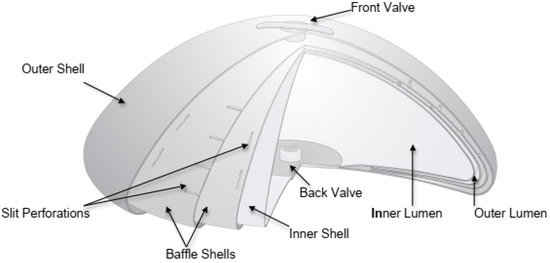 A cut-away drawing of a representative IDEAL IMPLANT (335 cc to 555 cc size) is provided in Figure 1 detailing its structure. The IDEAL IMPLANT is a smooth surface implant comprised of two lumens within a series of nested shells made from cross-linked silicone (polydimethylsiloxane) elastomer that are attached at the patch on the back of the implant. The inner lumen within the inner shell is filled through a valve in the posterior patch. The outer lumen within the outer shell and surrounding the inner shell is filled through a valve on the anterior surface. Unattached and floating within the outer lumen is a baffle structure designed to control movement of the saline in the outer lumen. The resistance to saline movement and additional structure of the implant has been described by some plastic surgeons as giving the implant an “apparent” viscosity that is similar to the viscosity of silicone gel. This baffle structure is comprised of one to three nested baffle shells that are perforated with slits so the saline is free to move through the slits, as well as around and between the baffle shells. In addition, the internal structure supports the outer shell so the upper portion of the implant does not collapse when the patient is upright and reduces the ability of the outer shell to fold upon itself and crease.