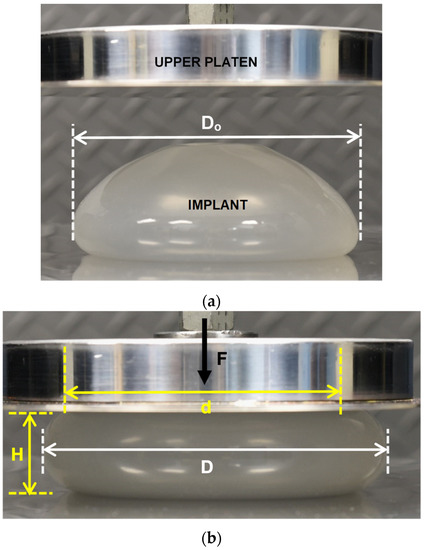 Unimplanted commercial implants were compressed between two parallel plates (platens) and data were analyzed using a new methodology. The laboratory apparatus used for testing was an Instron 5500R (Instron®, Norwood, MA, USA) equipped with a 1 kN load cell. This machine is computer-controlled and equipped with an automated data acquisition system. The Instron system measures the applied load versus the displacement. Data for the entire load–deflection curve is recorded by the computer system. The Instron can be operated with a variety of cross-head speeds producing a desired strain rate in the sample being tested. Both the upper and lower polished stainless-steel plates were very smooth, and had a measured surface roughness of about 0.18 micrometers. Figure 2a,b show the experimental setup for the compression testing. Figure 2a is a photograph of an implant prior to commencing the compression, and Figure 2b is a photograph of the same implant during a compression test at a load of 44.5 N.