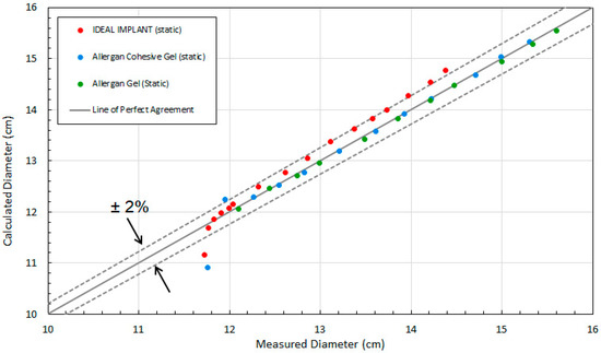 Figure 3 shows the calculated implant diameter D compared to the measured implant diameter for the static compression testing. As shown, the implant diameters calculated using Equation (4) are within about ±2% of the measured implant diameters. The average error of the calculated diameters relative to the measured diameters for loads of 22.2 N to 534 N were found to be 1.7%, 0.17%, and −0.25% for the IDEAL IMPLANT, Allergan cohesive gel, and Allergan gel, respectively. The errors in calculated diameter D for the IDEAL IMPLANT are greater than those for the Allergan gel implants, although the agreement is still considered to be very good. As illustrated by Figure 3, the geometric model given by Equation (4) overestimates the implant diameter for the IDEAL IMPLANT, and this difference is believed to be related to the dual lumen structure of the implant which is not entirely accounted for by the Equation (4) geometric model. The overestimate for the diameter using Equation (4) for the IDEAL IMPLANT is approximately linear with the measured diameter between 12.3 and 14.4 cm.