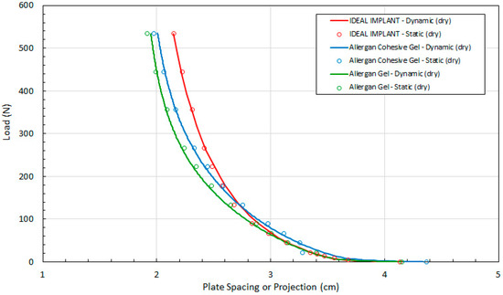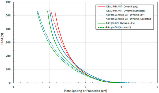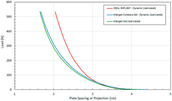 To evaluate the contribution of the frictional force between the platens and an implant, dynamic testing was also performed when both platens were lubricated with silicone oil (DPDM 400). As far as could be determined, no previous published breast implant study has considered the effect of lubricated platens on the response of implant shape due to compressive loading. The raw data for the dynamic tests using lubricated platens are presented in Figure 7 which shows the load versus the plate spacing for the three implants. Each curve was constructed from at least 52 experimental data points.