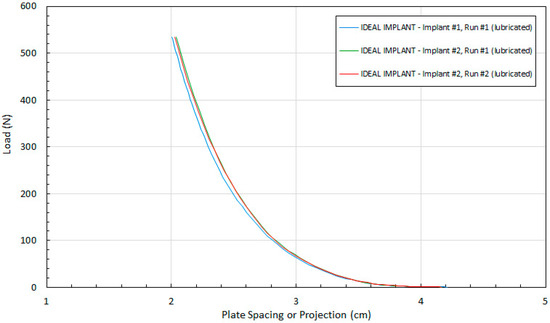 The excellent reproducibility of the test method is demonstrated in Figure 5. Figure 5 shows the tight agreement between implant projection and load for two different IDEAL IMPLANTs and duplicate runs with the same IDEAL IMPLANT. Note that the surface of “Implant #1, Run #1” was not completely dry before commencing the test, so the lubrication for this IDEAL IMPLANT consisted of a combination of silicone oil and any residual moisture on the surface of the IDEAL IMPLANT. The relative standard deviation of the three runs from their mean is ±0.56%, highlighting the consistency of the measurement method between implants and for replicate runs with the same implant.