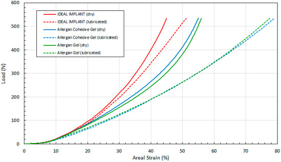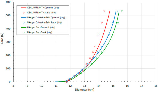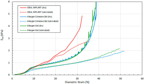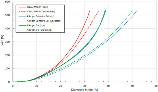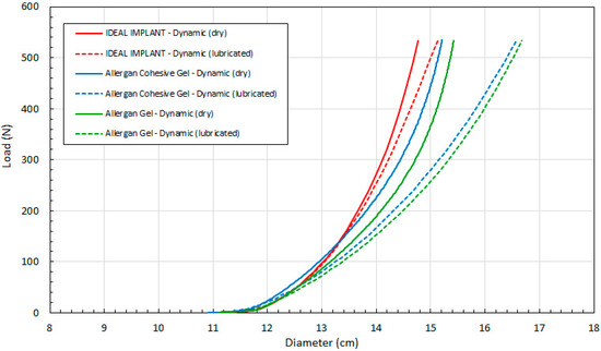 This data demonstrates that all three implants have similar diameters up to about 50 N, after which the IDEAL IMPLANT retains its diameter better than gel implants at a given load for both dry (solid lines) and lubricated (dashed lines) platen data. The differences between the dry and lubricated platen data for both gel implants are similar. As explained earlier and shown by Figure 3, the diameter of the IDEAL IMPLANT is actually overestimated by the theoretical calculation for D (Equation (4)), so the differences in diameters between the IDEAL IMPLANT and gel implants depicted in Figure 9 are likely conservative and even more pronounced.