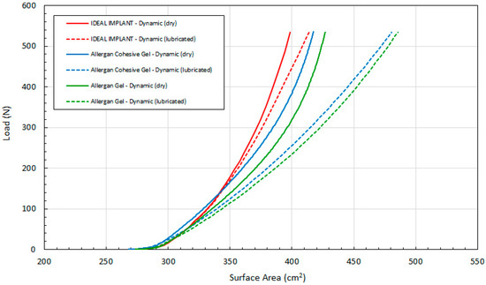 Lastly, Figure 10 compares load F as a function of calculated surface area A per Equation (5) for all 3 implants. Lubricated platens result in a larger implant surface area for a given load, and the relative difference between the IDEAL IMPLANT and gel implants increases with the load. The two gel implant curves have a similar shape, but the calculated surface area of the gel implant is greater than the calculated surface area of the cohesive gel implant for both dry and lubricated platens. The surface area differences between the IDEAL IMPLANT and gel implants are very pronounced using lubricated platens, demonstrating that the gel implants deform considerably more than the IDEAL IMPLANT at a given load. Note also that per Equation (5), the area is a function of the calculated D and measured H. Since the calculated D per Equation (4) overestimates the statically measured D (see Figure 3, for example), the surface area A for the IDEAL IMPLANT shown in Figure 10 would also be overestimated. Consequently, the differences between the IDEAL IMPLANT and the Allergan gel implants are likely even more pronounced than that shown, since the surface area A is a quadratic function in D.