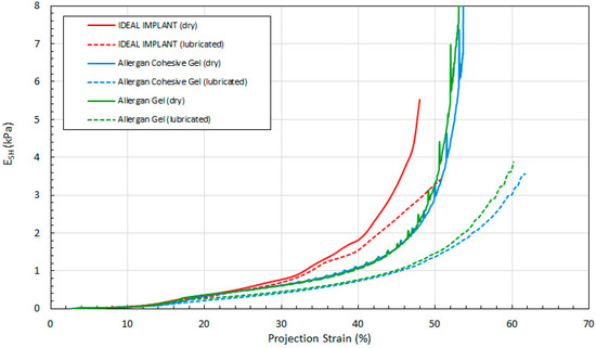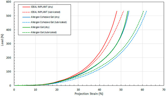 The implant projection at a given load F is also similar for all implants, and for lubricated and dry platens, for loads up to about 50 N. Again, although these similarities are noted, the Allergan cohesive gel implant had an initial measured projection at 0.445 N that was about 5% higher than the IDEAL IMPLANT and Allergan gel implant, which should be considered when directly comparing the curves of Figure 8.